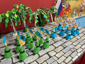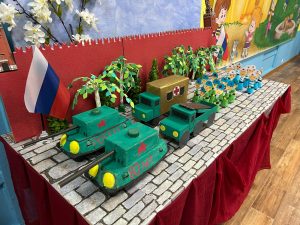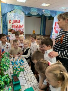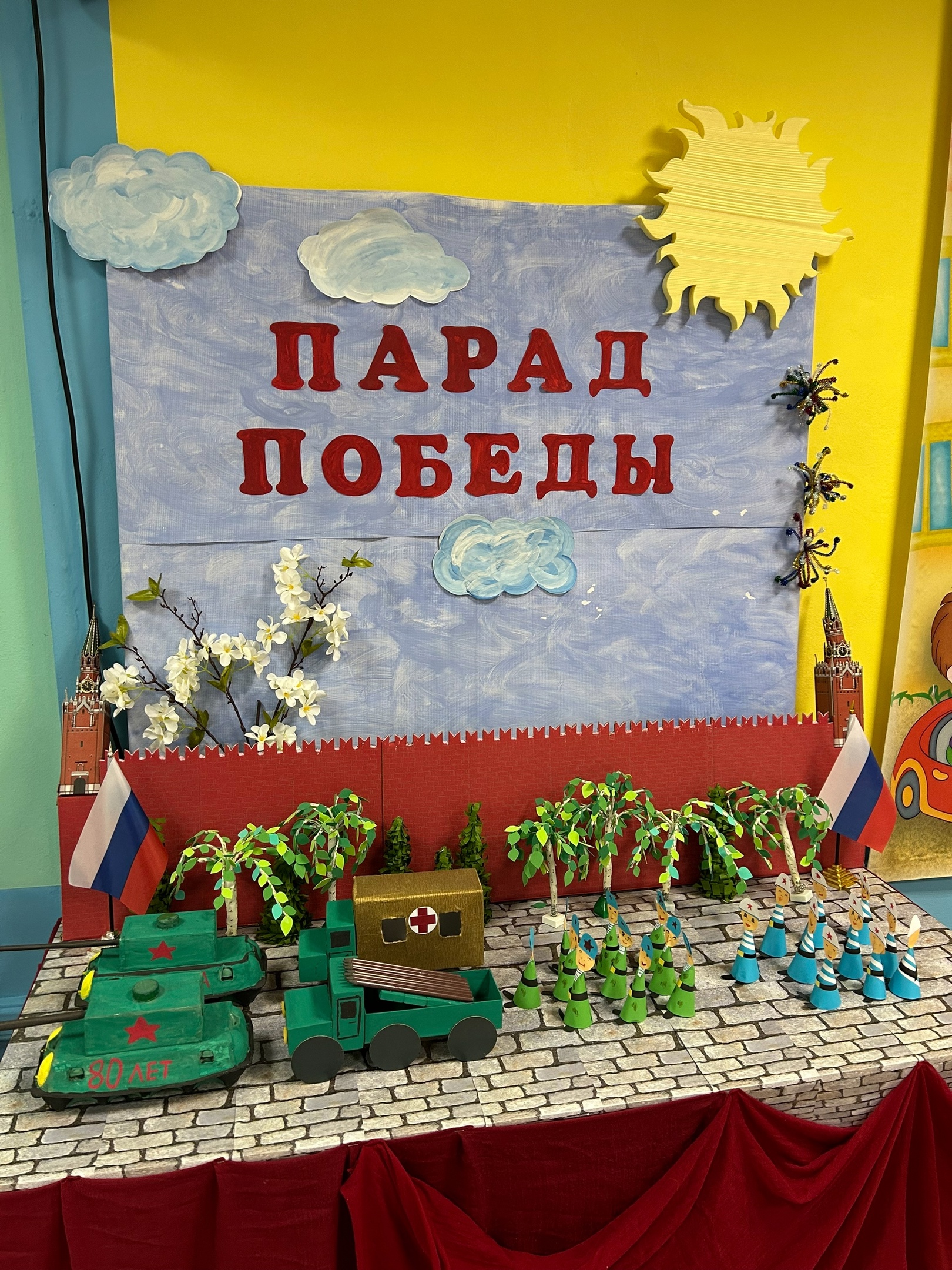 В рамках регионального проекта ” Предшкола- стандарт детского сада” на тематической неделе “Моя Россия” у нас был тоже парад Победы, только выполненный собственными руками из бумаги и картона. Трудились над инсталляцией все группы и вот такая красота получилась.